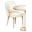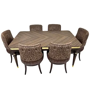 Luxury rectangular dining table with wood grain top + 6 soft upholstered chairs with gold details.