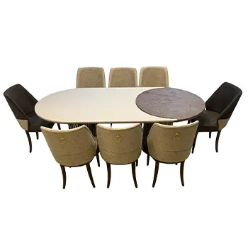 Luxury oval dining table with marble top and mixed beige-brown chairs with gold details.