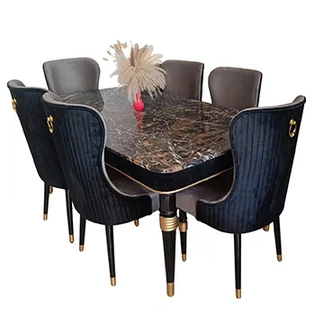 Elegant rectangular black marble table + 6 plush dark blue velvet chairs with gold details.