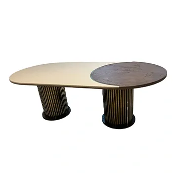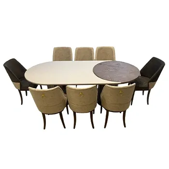 This beautiful dining set has an oval table in light color with a round marble top in the center. It comes with 8 comfortable chairs – some in beige fabric and some in dark brown. The chairs have gold accents for a stylish look. Perfect for family meals or guests.