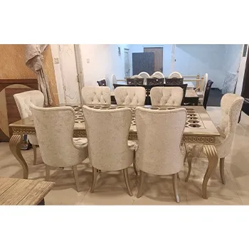 This dining table set comes with a large table and 8 comfortable chairs. The table has a stylish top design and strong carved legs. The chairs are soft and comfortable with a high back. Perfect for big families and dinner parties.