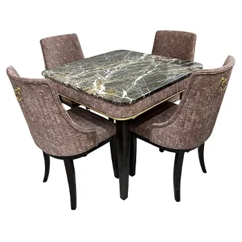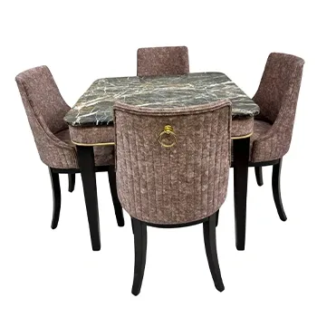 This stylish 5-piece dining set features a beautiful square table with a stunning green marble top and gold trim. It comes with 4 comfortable, curved barrel-style chairs upholstered in rich brown (or pinkish-brown) velvet fabric. Chairs have gold ring handles on the back and sleek black wooden legs. Perfect for modern or glamorous homes – luxurious look, very comfy seating for 4 people. Great for family dinners or small gatherings!