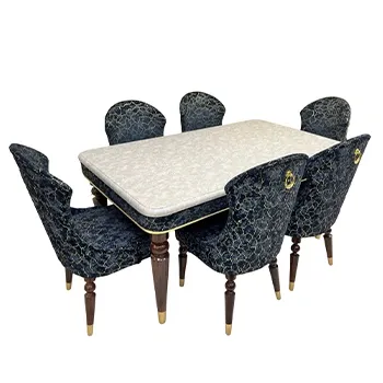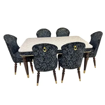 This is a beautiful dining table set with one marble top table and six chairs. The table has a light-colored marble surface. The chairs are dark navy blue with a gold pattern design. Each chair has wooden legs with gold tips and a gold ring on the back. The design looks modern and classy. It is perfect for a dining room and gives a royal and luxury look to your home.